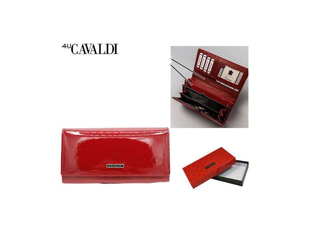 Dámska kožená lakovaná peňaženka značky CAVALDI Peňaženka obsahuje 9 priečinkov na karty, 5 priečinkov na papierové peniaze, z toho sa jeden zapína na zips. Mincovník sa zapína na kovovú sponu a má dve časti. Peňaženka sa zapína na kovový cvok. Peňaženka je balená v krabičke.