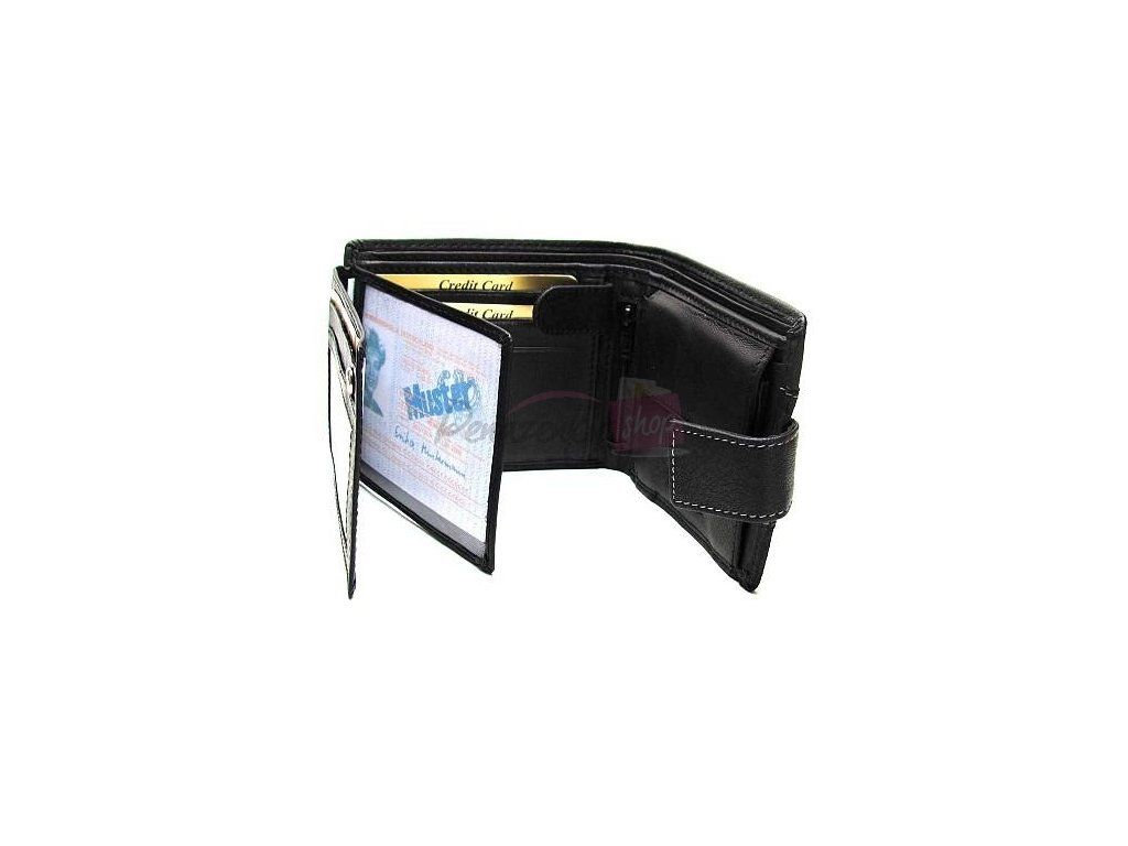 Pánska peňaženka ušitá z mäkkej kože. Peňaženka je flexibilnejšia a mäkkšia vďaka precíznemu spracovaniu kože. Peňaženka sa uzatvrára preklopom s patentom. Vo vnútri sa nachádzajú 2 priehradky na bankovky, mincovník s dvoma komorami, 3 transparentné priečinky na doklady, 8 záložiek na karty.
